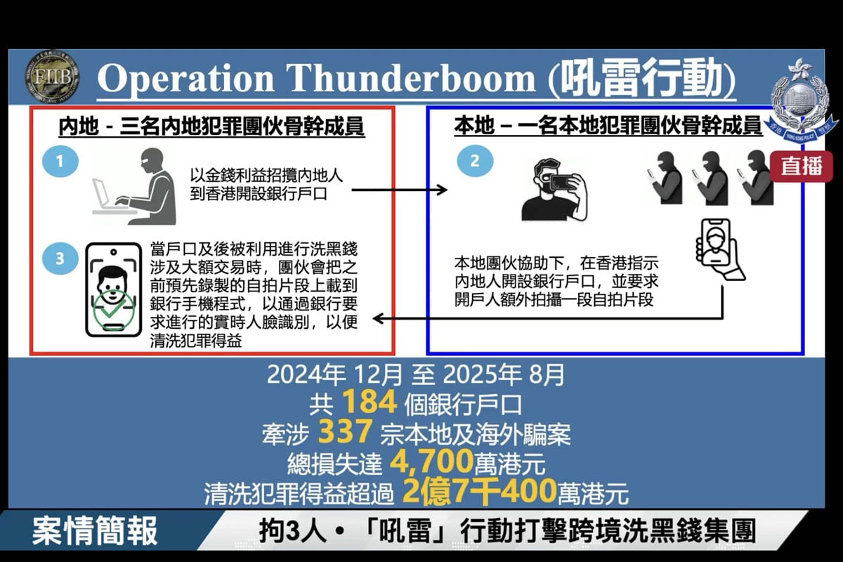 警方聯同大陸公安在過去兩日(14至15日)偵破一個跨境洗黑錢集團,涉嫌從大陸招攬成員到港在「數字銀行」開設傀儡戶口作洗黑錢,並拍攝「預製片」用作人臉識別驗證。警方指,有關戶口於去年12月至今年8月期間,合共清洗2.74億港元懷疑犯罪得益,行動中3人被捕。