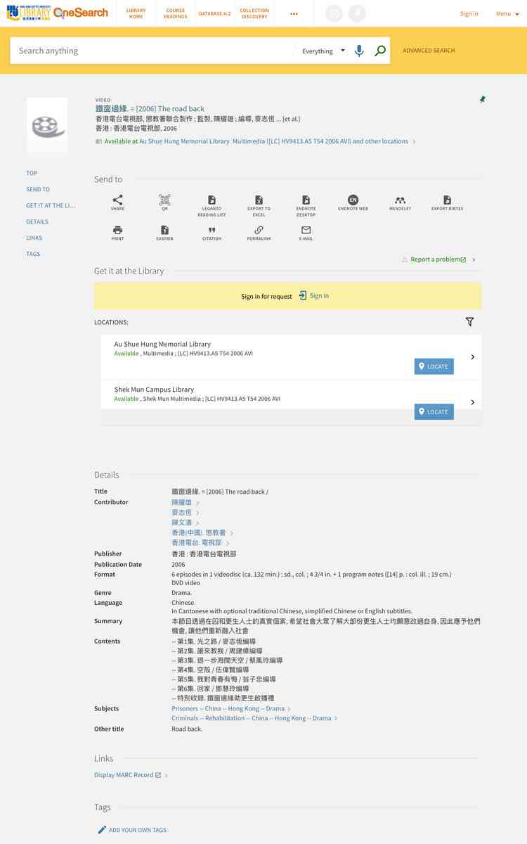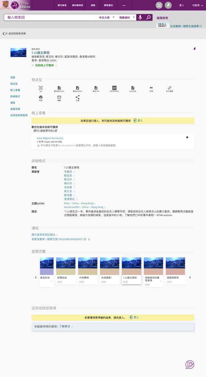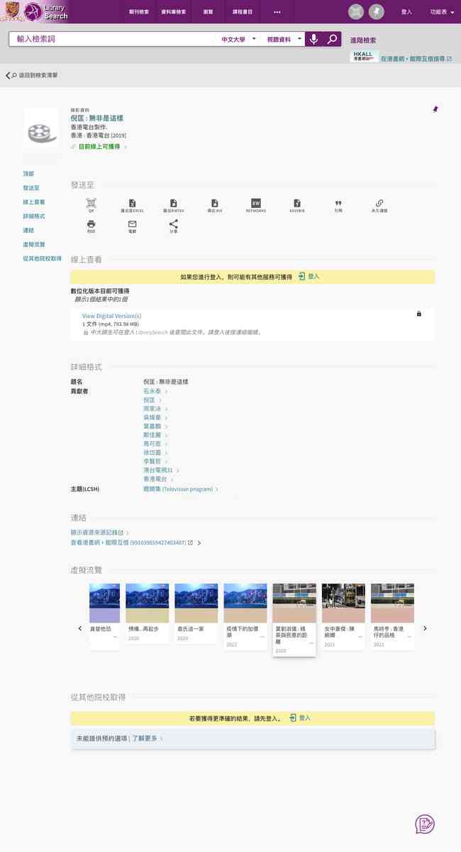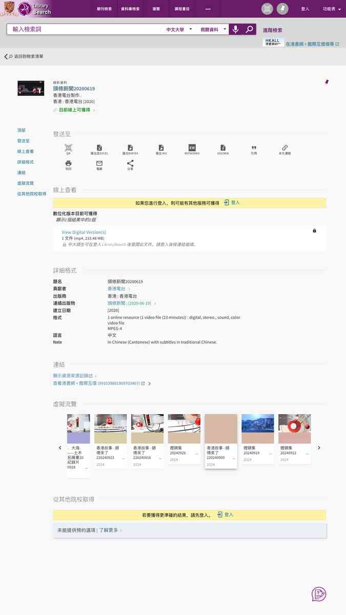 本報15日在中文大學圖書館網頁,以「香港電台」為關鍵字搜尋視聽資料時,搜尋到15,678 檢索結果。當中更包括歷年的《頭條新聞》、《鏗鏘集》「7.21誰主真相」、邀請反共作家倪匡作嘉賓的2019年節目《時代的記錄——鏗鏘說》等。上述節目均顯示,中大師生可在登入系統後查閱。