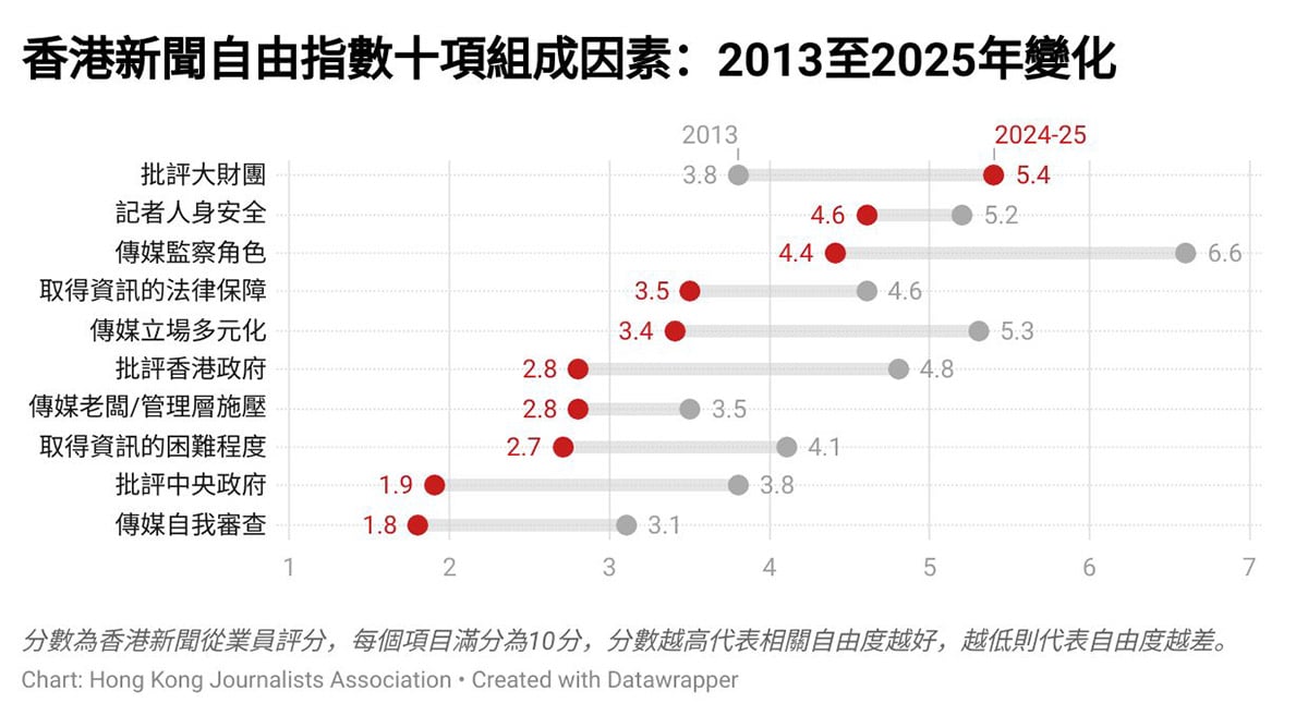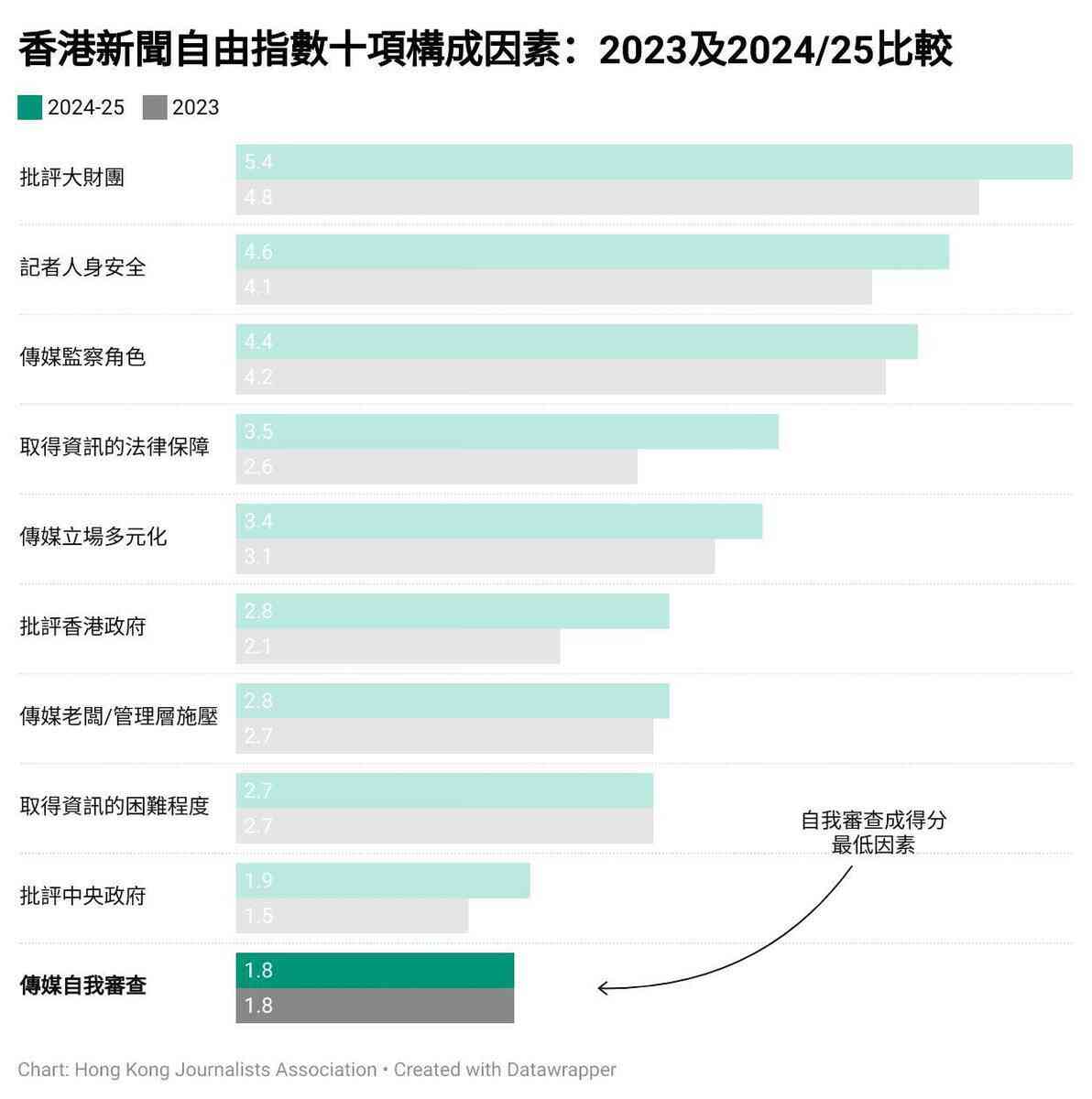 同時,各項因素的評分水平均仍處低位。除了「傳媒顧忌批評大財團」一項是高於5分中間值,其餘9項因素皆低於5分,並有5項少於3分,形容香港新聞自由狀況仍然相對惡劣。
