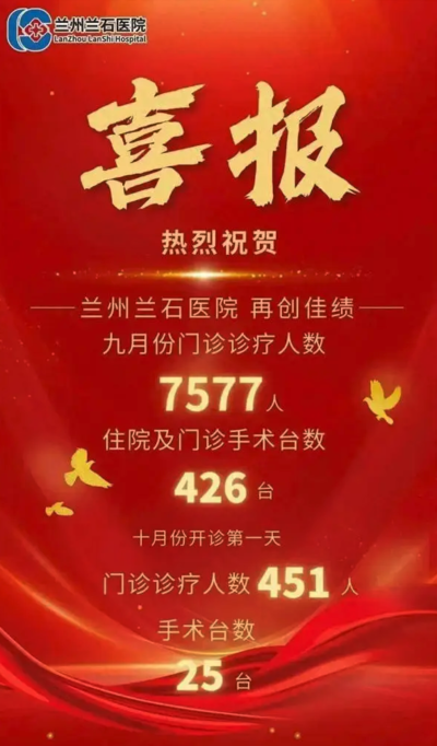 近日,甘肅一所綜合性「二級」醫院——蘭州蘭石醫院發布一份「喜報」,祝賀該院9月、10月門診人數「創佳績」,引發極大爭議。
