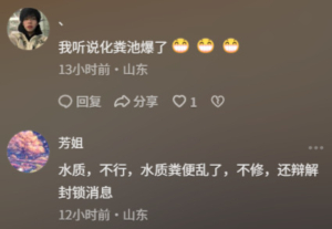網民們批評,「水質不行,水、糞便亂了不修,還辯解封鎖消息。」「發影片吐槽被說成是境外勢力。」「上下起手一起黑啊!涉事單位關係很硬,上送禮下欺瞞,濱州就這麼黑。」