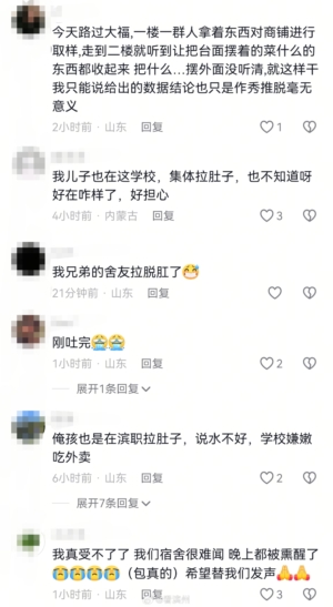 10月16日,濱州一位博主「看濱州」發帖稱,近日,山東濱州職業學院「集體腹瀉」話題在網上傳播,多為該校學生網上吐槽集體腹瀉並懷疑與宿舍飲水飲食有關。一些學生反映,該校宿舍下水道反味、發臭等,很多學生囤桶裝水、瓶裝水,有些嚴重的學生還去了醫院或診所吊鹽水。