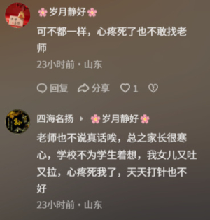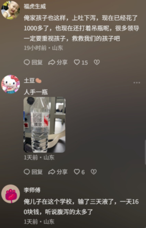 據一些家長在社交平台留言表示,「俺兒子在這個學校,輸了三天液了,一天160塊錢,聽說腹瀉的太多了。」「俺家孩子也這樣,上吐下瀉,現在已經花了一千多了,現在還打著吊瓶呢,很多領導一定要重視孩子,救救我們的孩子吧。」
