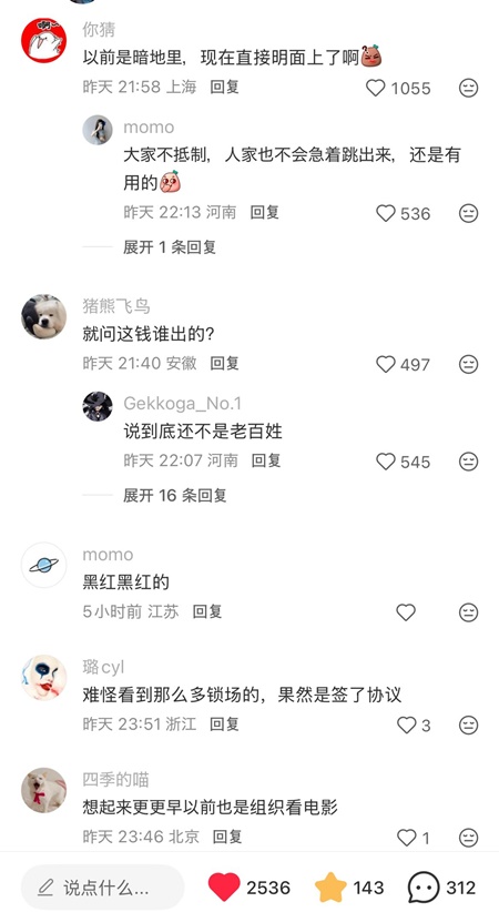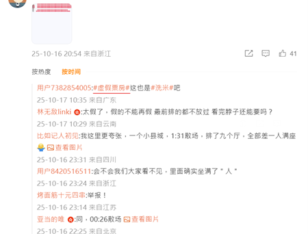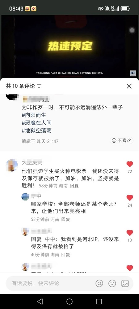 「已經打過電話質問教育局!學校組織看電影是不是他們下達的任務。」「公然造假了,為了甚麼呢,大家懂嗎?」「夜裏1:26散場,都滿座。」「舉報舉報,我第一次知道原來還可以這麼操作,光天化日之下,演都不演了。」