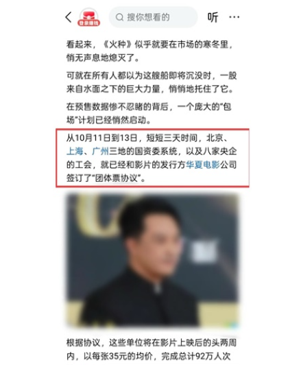 據網易10月16日報道,當日《火種》上映,某電影院竟然滿場。最匪夷所思的是,滿座的還是VIP影廳,票價都比其它場的貴30元人民幣。排片最多的是武漢影院,有兩家電影院出現兩場滿座的情況,恰好兩場都是10點放映。