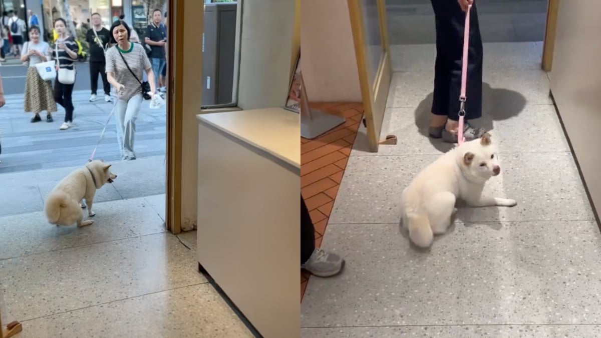 影片中,一位女主人帶著一隻白色的小柴犬在逛街,結果小狗在一家麵包店門口賴著不肯走了,主人多次嘗試拉拽未果。
