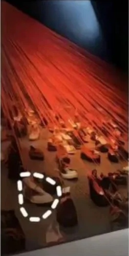 網民聚焦的一個展品,是展示成百上千條形如微血管的紅線,每條紅線末端都牽著一隻舊鞋子,鞋子樣式不一。網民懷疑,如果這些鞋子是死者遺物,那麼這麼多鞋子就可能不僅僅涉及明星,有可能牽涉大規模綁架和虐殺,甚至中共大規模活摘器官的罪惡。尤其是寶格麗酒店和啟皓藝術館隸屬國企,更讓人懷疑是否牽扯官方主導的黑色產業鏈。