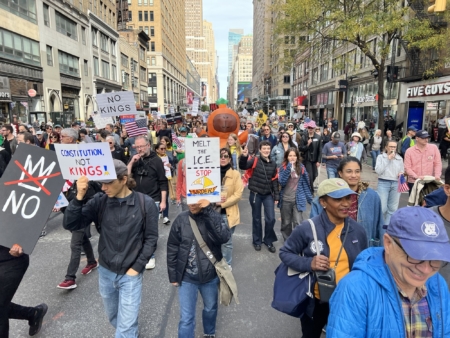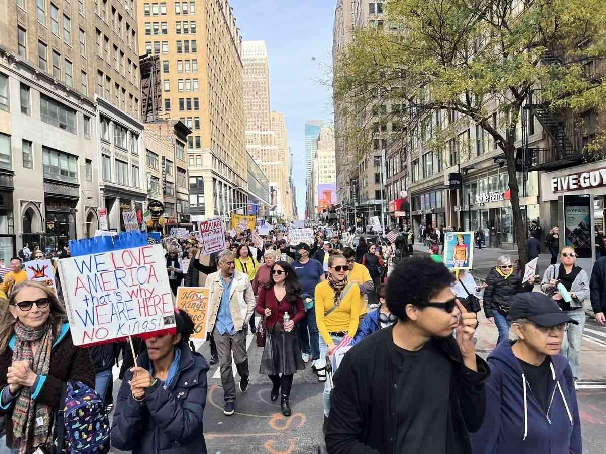 上周六(10月18日),全美多地發起「不要國王」(No Kings)遊行,紐約市也是其中一個地點。活動人士從曼哈頓的達菲神父廣場(Father Duffy Square)沿著第七大道和平遊行至第十四街,抗議聯邦政府長期關門以及總統特朗普部署美國移民及海關執法局(ICE)探員協助移民執法,遊行大約走了2個小時。