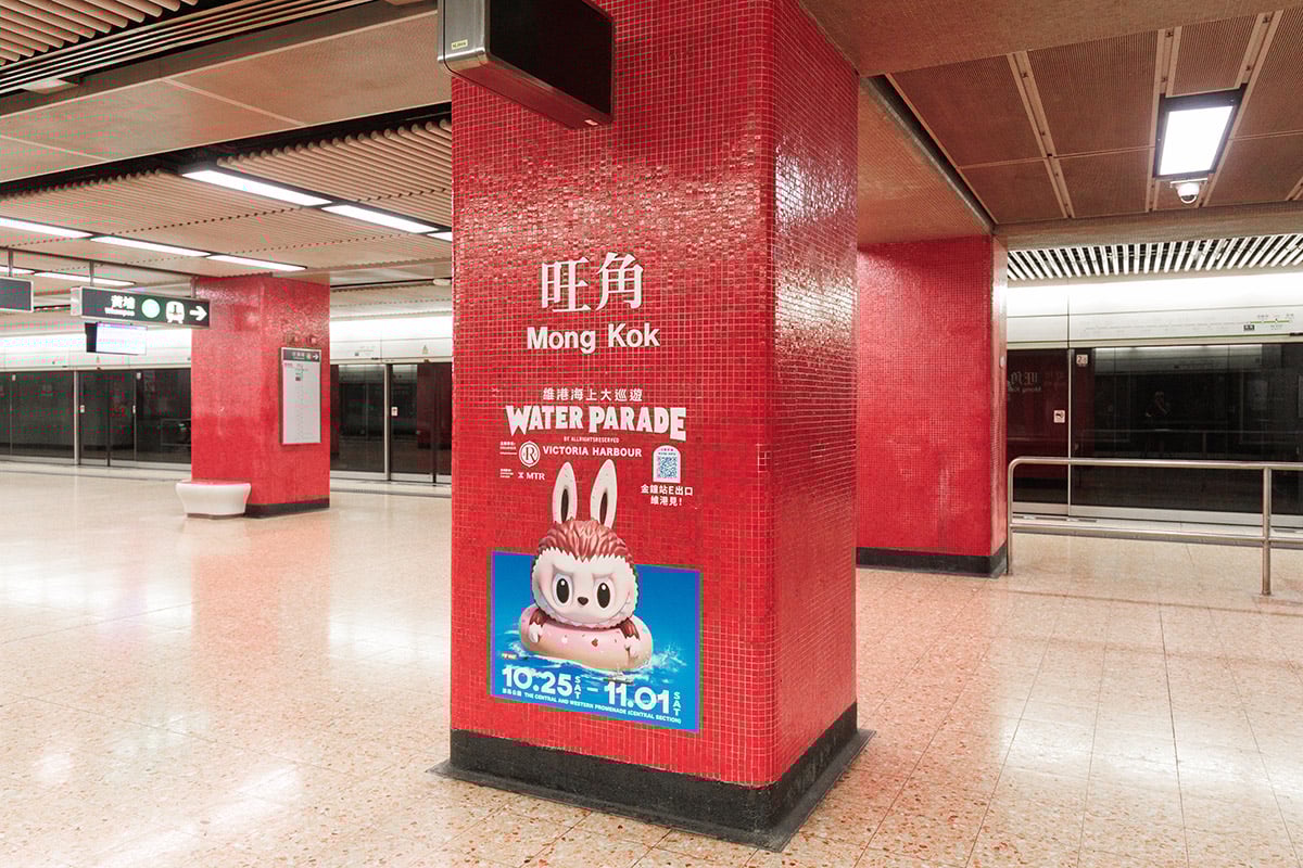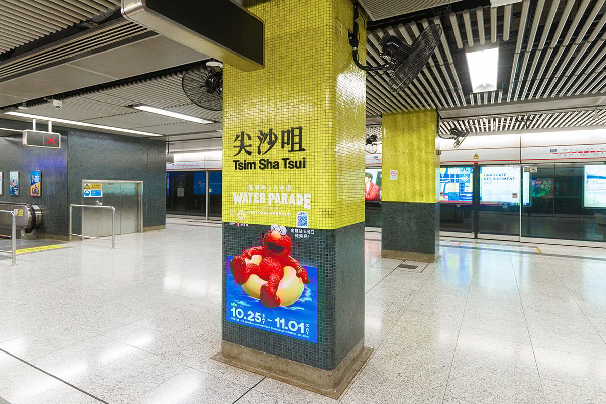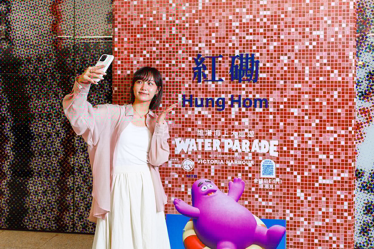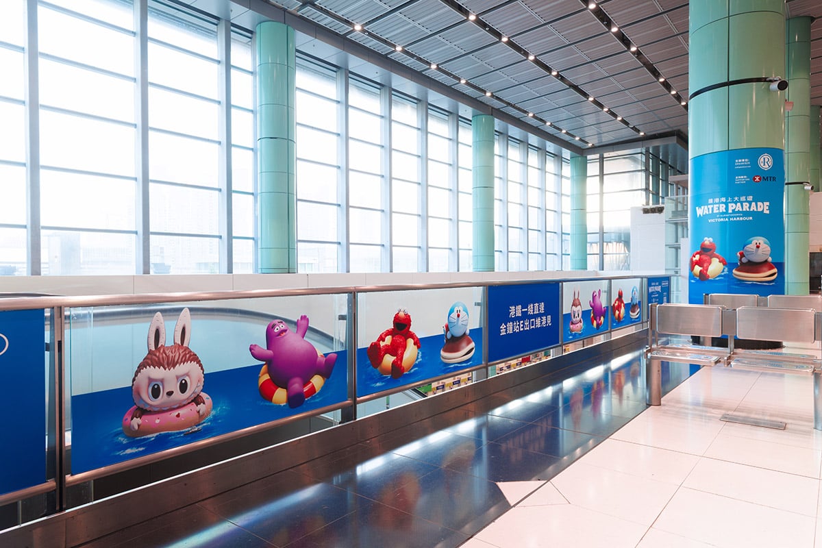 作為「維港海上大巡遊」的前哨活動,4位人氣角色以活動主視覺造型亮相,包括抱著豆沙包的多啦A夢、躺在水泡上的滑嘟嘟及KAWS & 芝麻街(Elmo),以及躺在冬甩水泡上的LABUBU,分別出現於中環站、銅鑼灣站、尖沙咀站、旺角站及紅磡站的牆柱,讓乘客盡情打卡合照。大陸訪港旅客所途經的落馬洲站到境大堂,亦將以4位人氣角色造型主題作裝飾。