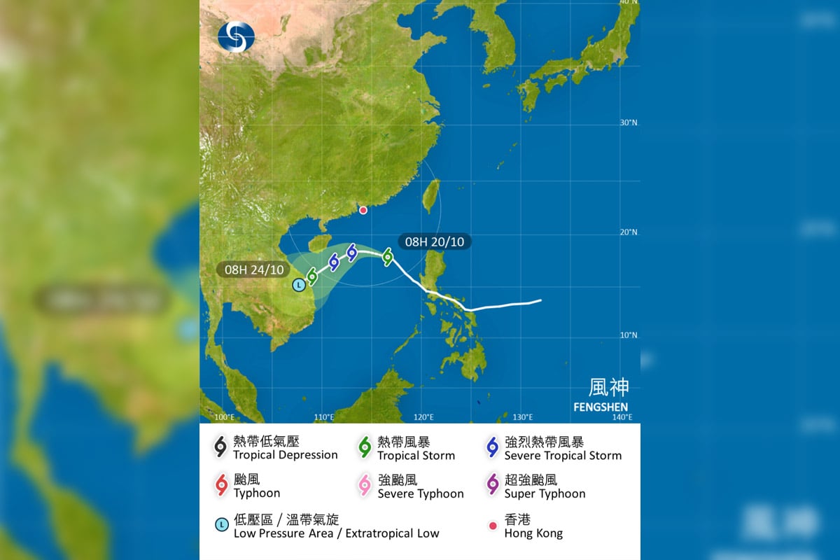 在上午10時,熱帶風暴風神集結在東沙以南約300公里,預料向西北偏西移動,時速約18公里,橫過南海中北部。