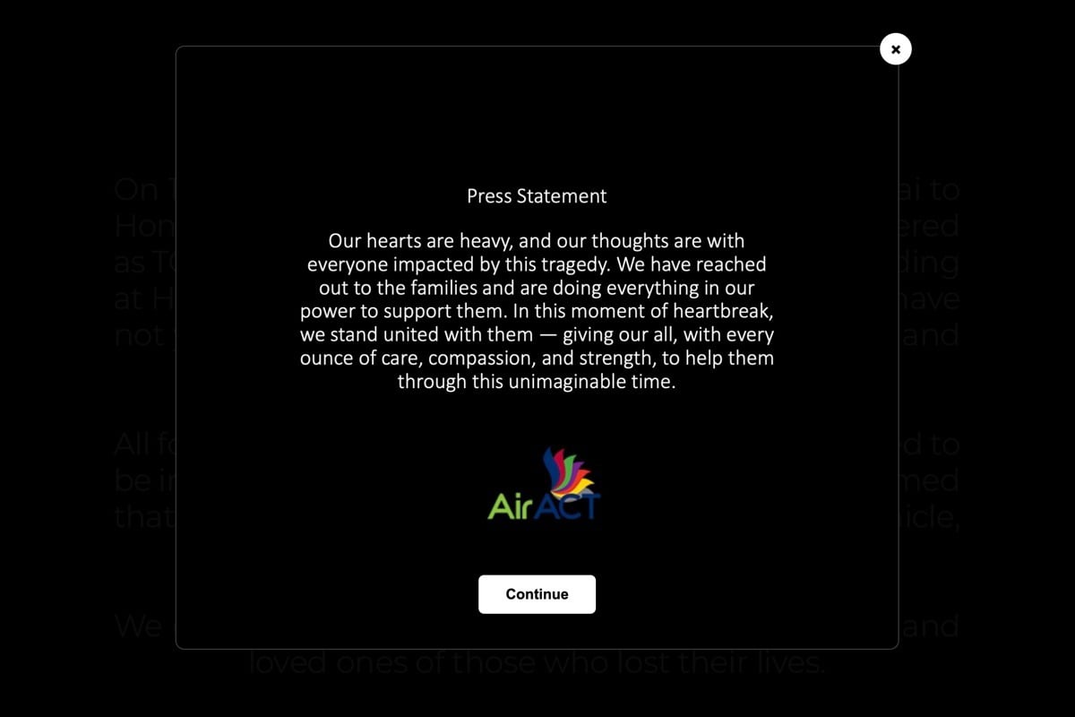 事隔兩日,ACT Airlines網頁在22日上載聲明,稱對今次悲劇感到心情沉重,稱已聯絡家屬並儘可能提供協助,會與家屬站在一起。該公司另一篇聲明則稱,ACT Airlines正與官方調查團隊保持密切聯繫,並全力配合,盡最大努力協助調查工作。@