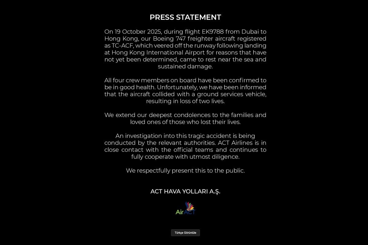 出事貨機由ACT Airlines「濕租」予阿聯酋航空,由前者負責營運。阿聯酋航空20日表示,對兩名機場地面工作人員離世深感難過,並對其親屬及同事致以深切慰問。航班營運方ACT Airlines及其它相關持份者亦正全力配合調查。