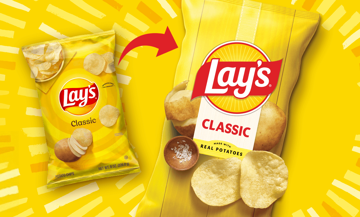 新視覺標識展示較溫暖且明顯的太陽圖案,並以土豆種植環境為靈感設計輻射狀「Lay's光芒」。包裝色系根據配方成分調配,特寫照片強調薯片質地、調味與金黃色澤,採用消光包裝表面減少零售燈光反光並提升遠距離辨識度。