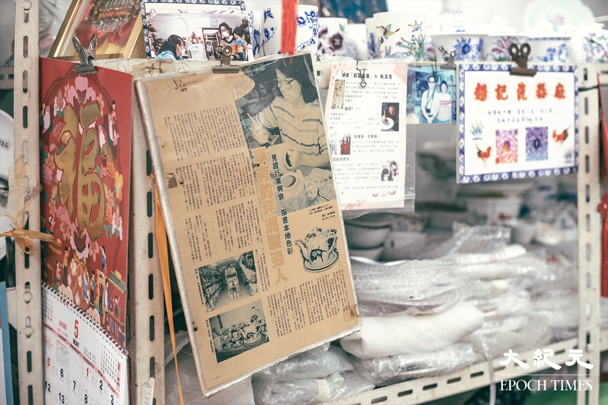 一踏入店內,兩旁架上陳列着琳瑯滿目的彩瓷作品,每件都由店主藍嬌女士親手繪製,大家都親切地稱她為「嬌姐」。她以細膩的筆觸將花鳥魚蟲栩栩如生地呈現在白瓷上,工筆精緻,色彩柔和,令人讚嘆不已。牆上掛着一張泛黃的舊雜誌報導,相中是年輕時的嬌姐,見證她多年來在彩瓷藝術上的堅持與付出。