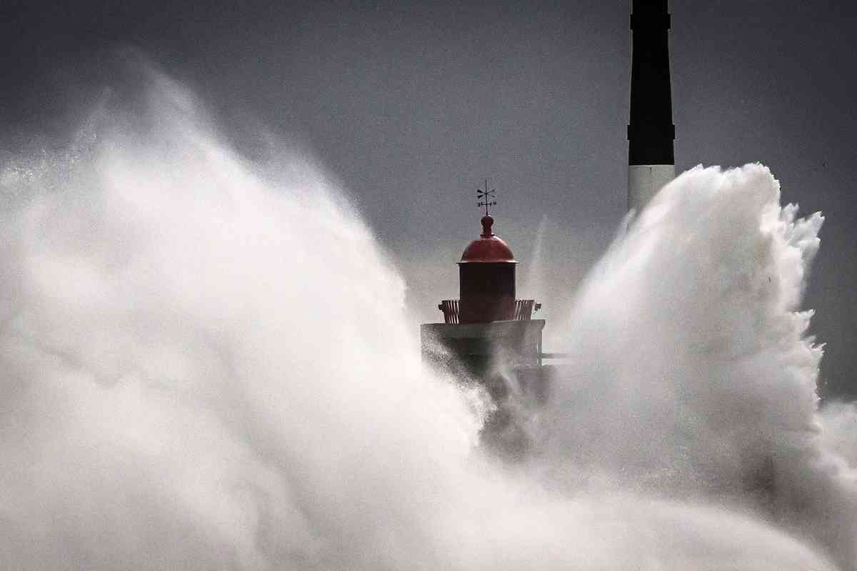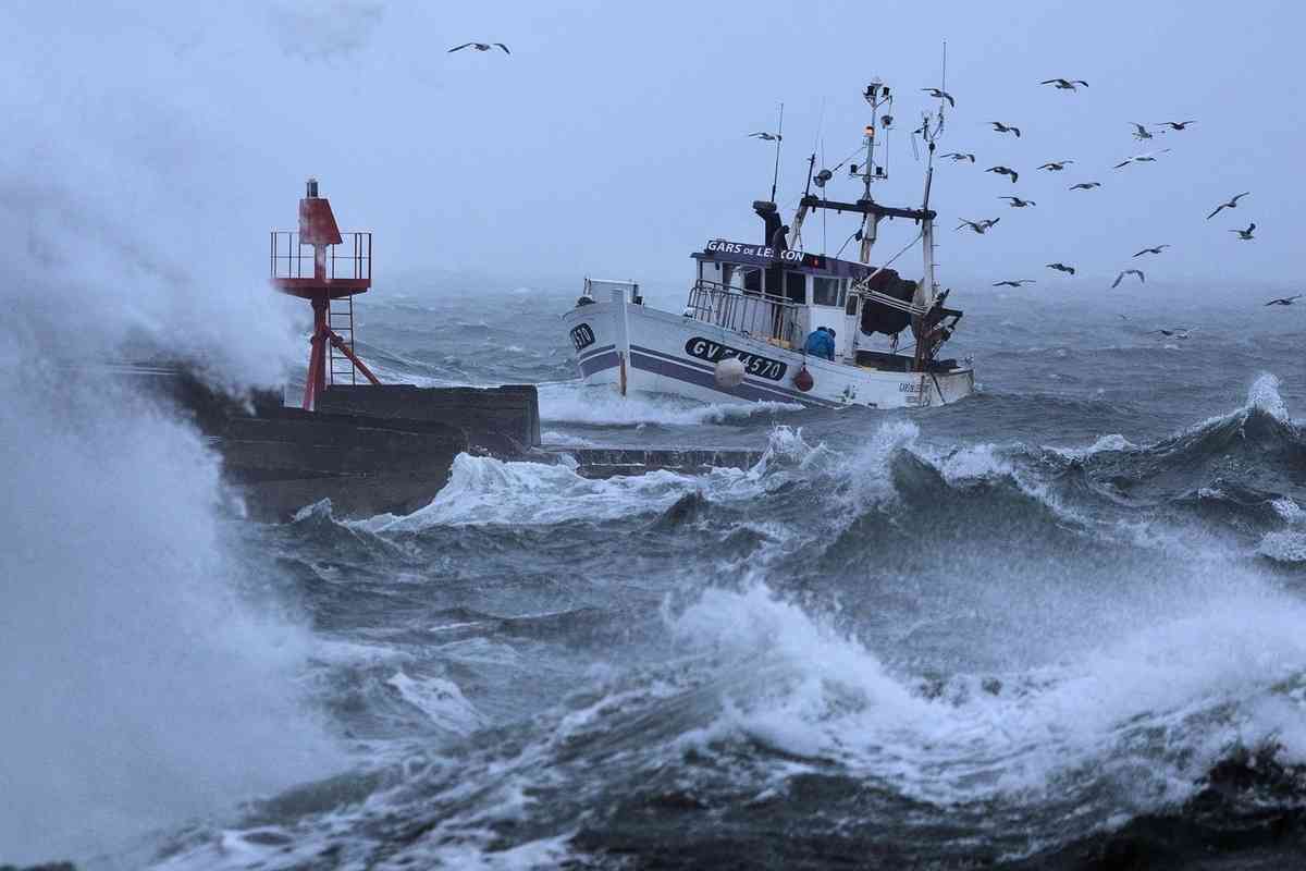 2025年10月22日,風暴「班哲文」(Benjamin)登陸前,一艘漁船頂著巨浪和強風,抵達法國西部城市普洛巴納萊克-萊斯科尼勒(Plobannalec-Lesconil)的港口。(Fred Tanneau/AFP via Getty Images)