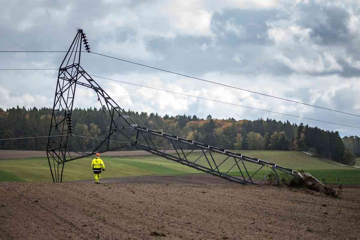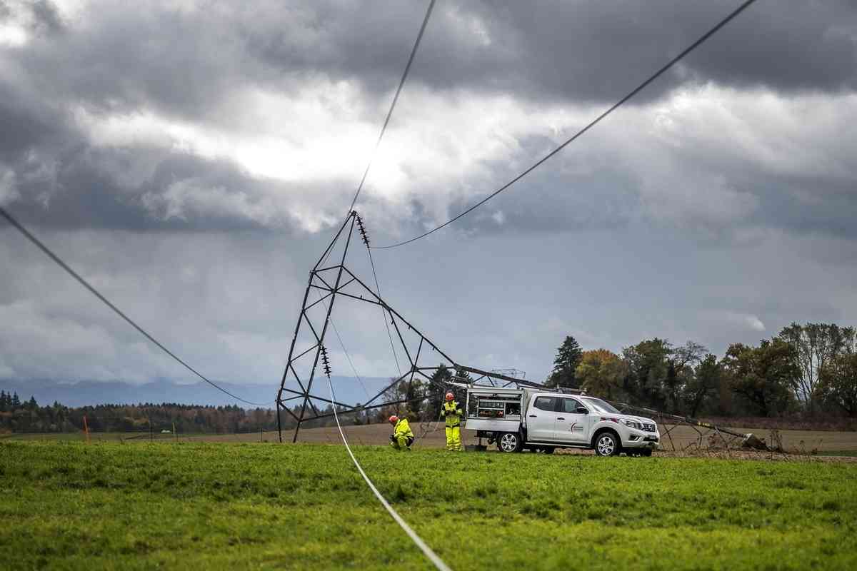 2025年10月23日,風暴「班哲文」(Benjamin)席捲瑞士期間,沃州比耶爾市(Biere)附近的一座電塔被強風吹倒。(Fabrice Coffrini/AFP via Getty Images)