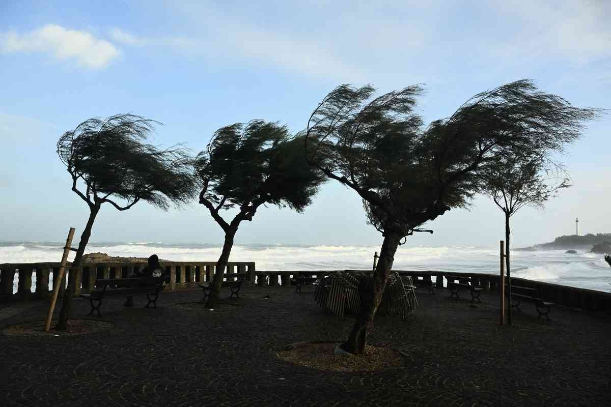 2025年10月23日,風暴「班哲文」(Benjamin)席捲法國期間,西南部城市比亞希斯(Biarritz)沿海地區的樹木在強風中搖曳。(Gaizka Iroz/AFP via Getty Images)
