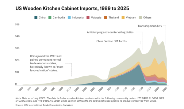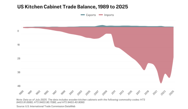 美國貿易遊說集團「美國繁榮聯盟」(Coalition for a Prosperous America)的一份報告顯示,2022年,進口廚櫃數量激增,搶走了美國生產商超過40億美元的市場份額。到2024年,僅廚櫃一項的貿易逆差就已增長至37億美元。