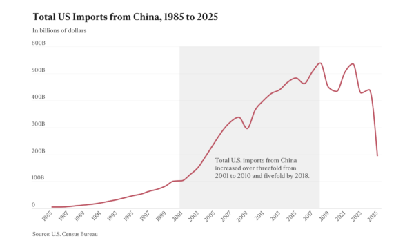 到了2010年,中國成為了世界第一大商品出口國。美國人口普查局(Census Bureau)的數據顯示,2001年至2010年,美國從中國的進口總額增長了三倍多,到2018年的時候,進口總額已經增長到五倍。