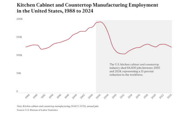 根據美國勞工統計局(Bureau of Labor Statistics.,簡稱BLS)的數據,2005年至2024年間,美國廚櫃和廚房枱面製造業將減少68,600個工作崗位。