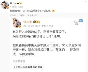 10月22日,一位關注此事的微博博主表示,「有關野人小孩的帖子,已經全軍覆沒了,接連收到多條『僅自己可見』的通知。」該博主並表示,「鐵鏈那時候,帖子沒收的速度都沒這麼快。」