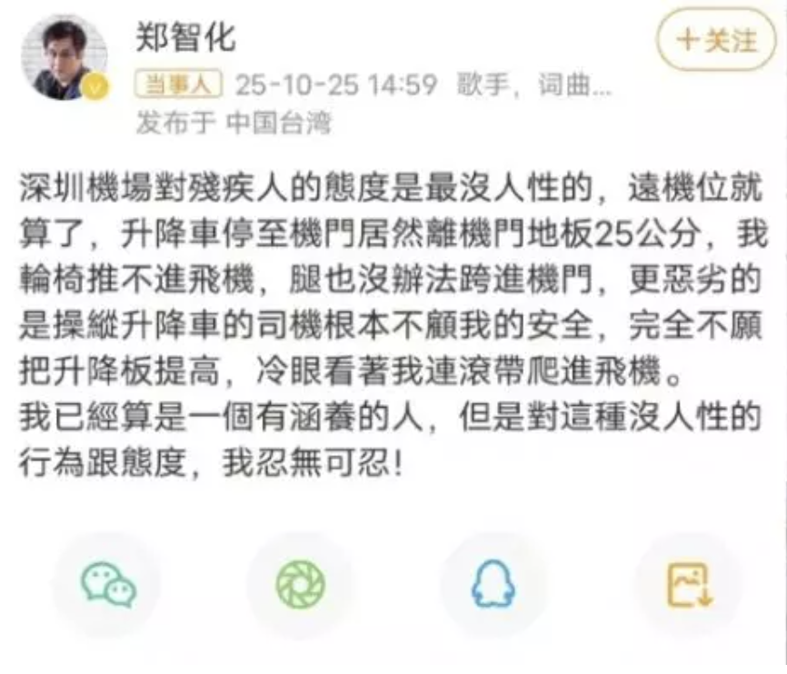 近日,台灣歌手鄭智化發文批評,深圳機場沒人性,他說,他的輪椅推不進飛機,只能連滾帶爬進飛機。對此,深圳機場承諾整改。