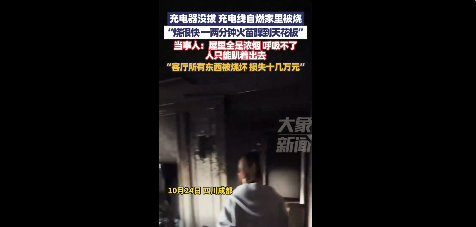 近日,四川成都發生一宗因充電器未拔引發的火災事故,當事人家中客廳物品幾乎全部燒燬,初步估計損失超十萬元人民幣。事發時張先生和家人正在屋內,「一兩分鐘,整個客廳就全是火了。人根本沒法呼吸」。所幸他們及時逃出,未造成人員傷亡。