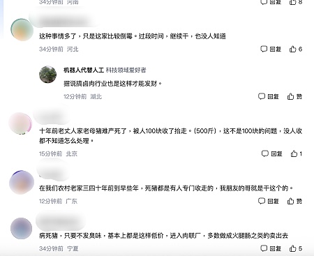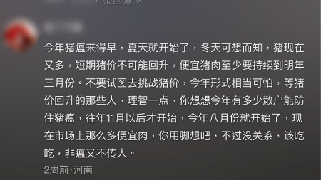 有養豬戶在社交媒體帖文,暗示市場上出售的超低價豬肉很可能是病死豬:「今年豬瘟來得早,夏天就開始了,冬天可想而知,豬現在又多,短期豬價不可能回升,便宜豬肉至少要持續到明年3月份。不要試圖去挑戰豬價,今年形式相當可怕,等豬價回升的那些人,理智一點,你想想今年有多少散戶能防住豬瘟,往年11月以後才開始,今年8月份就開始了,現在市場上那麼多便宜肉,你用腳想吧,不過沒關係,該吃吃,非瘟又不傳人。」