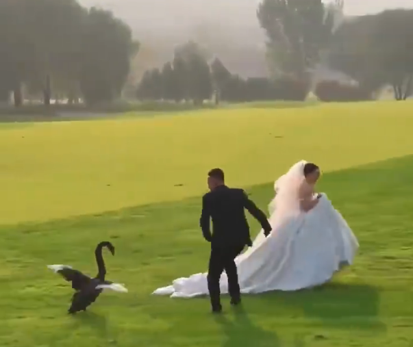 網傳的影片顯示,近日,一對新人正在草坪上拍婚紗照。一隻 「不速之客」(黑天鵝)突然闖入,直接追著新娘而去,新娘嚇到趕快跑開。這時,新郎用捧花驅離它,但黑天鵝的目標似乎不是新郎,它仍緊追著新娘跑。