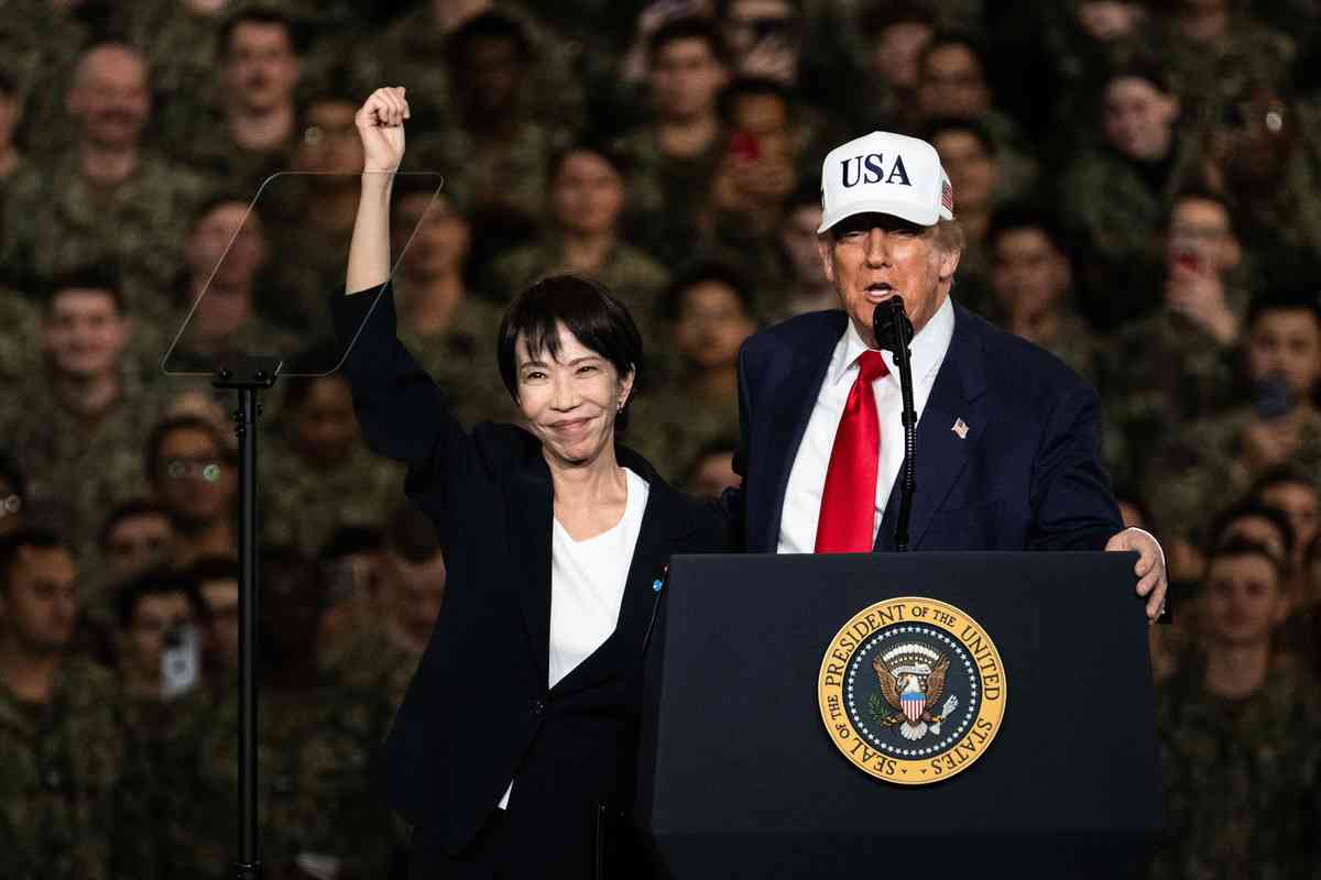 特朗普與高市早苗會談之後,兩人一同搭乘美國總統直升機專機「陸戰隊一號」,前往橫須賀的駐日美軍軍港,登上「喬治華盛頓號」航母。特朗普向6000名駐日美軍官兵發表演說,並宣布已批准首批美製導彈交付日本自衛隊。