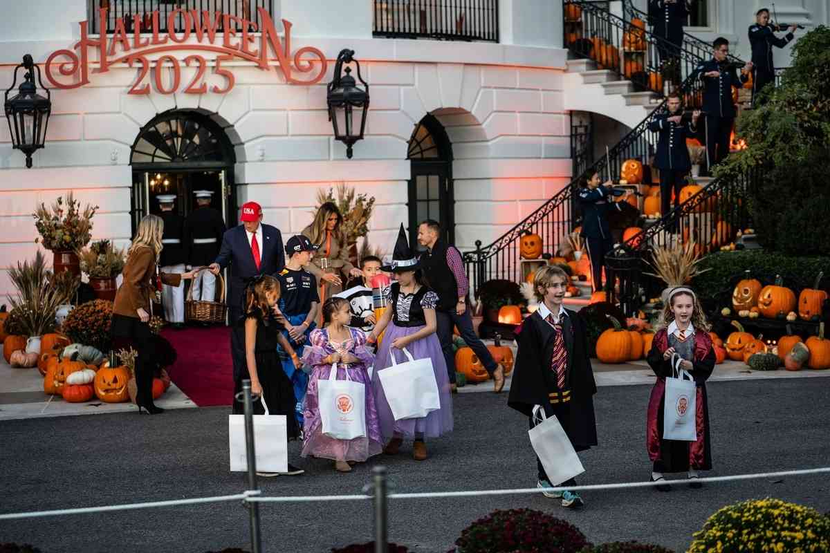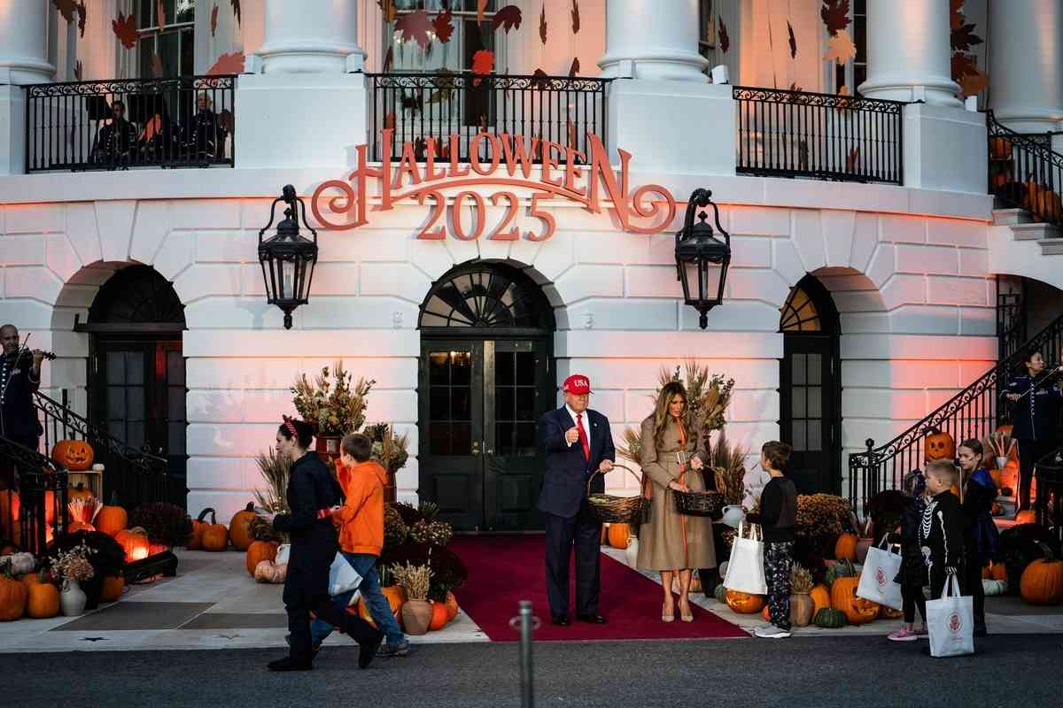 2025年10月30日,美國總統特朗普與第一夫人梅拉尼婭(Melania Trump)在白宮南草坪舉行的萬聖節活動中,向來訪的孩子們發放糖果。(Madalina Kilroy/大紀元駐白宮記者)