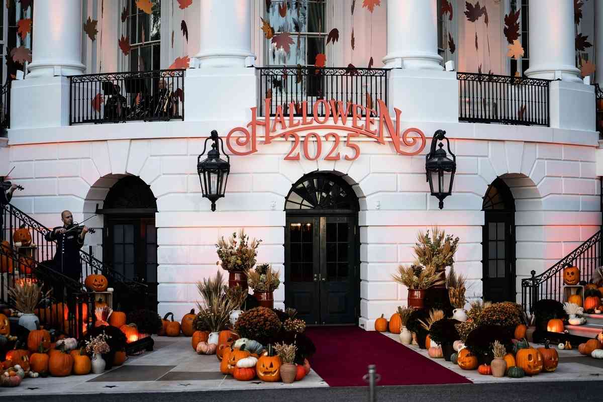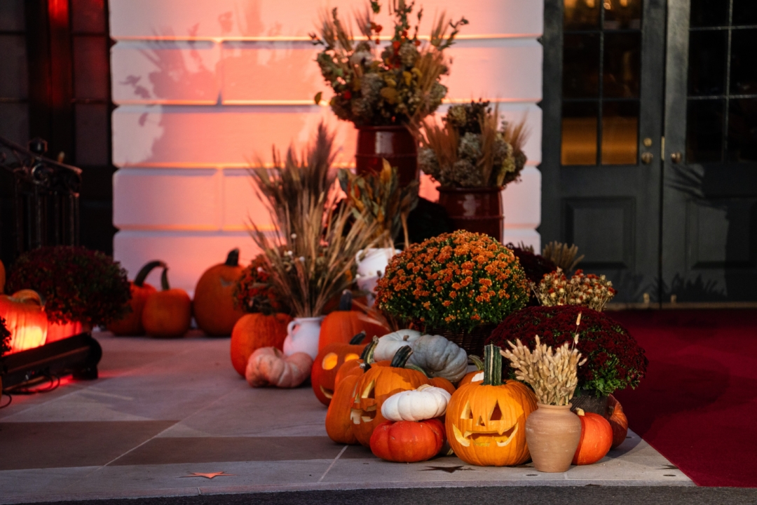 白宮南草坪和南門廊布置了傑克南瓜燈(Jack-o’-lanterns)和其它萬聖節主題裝飾,揚聲器播放著各種應景的萬聖節音樂。