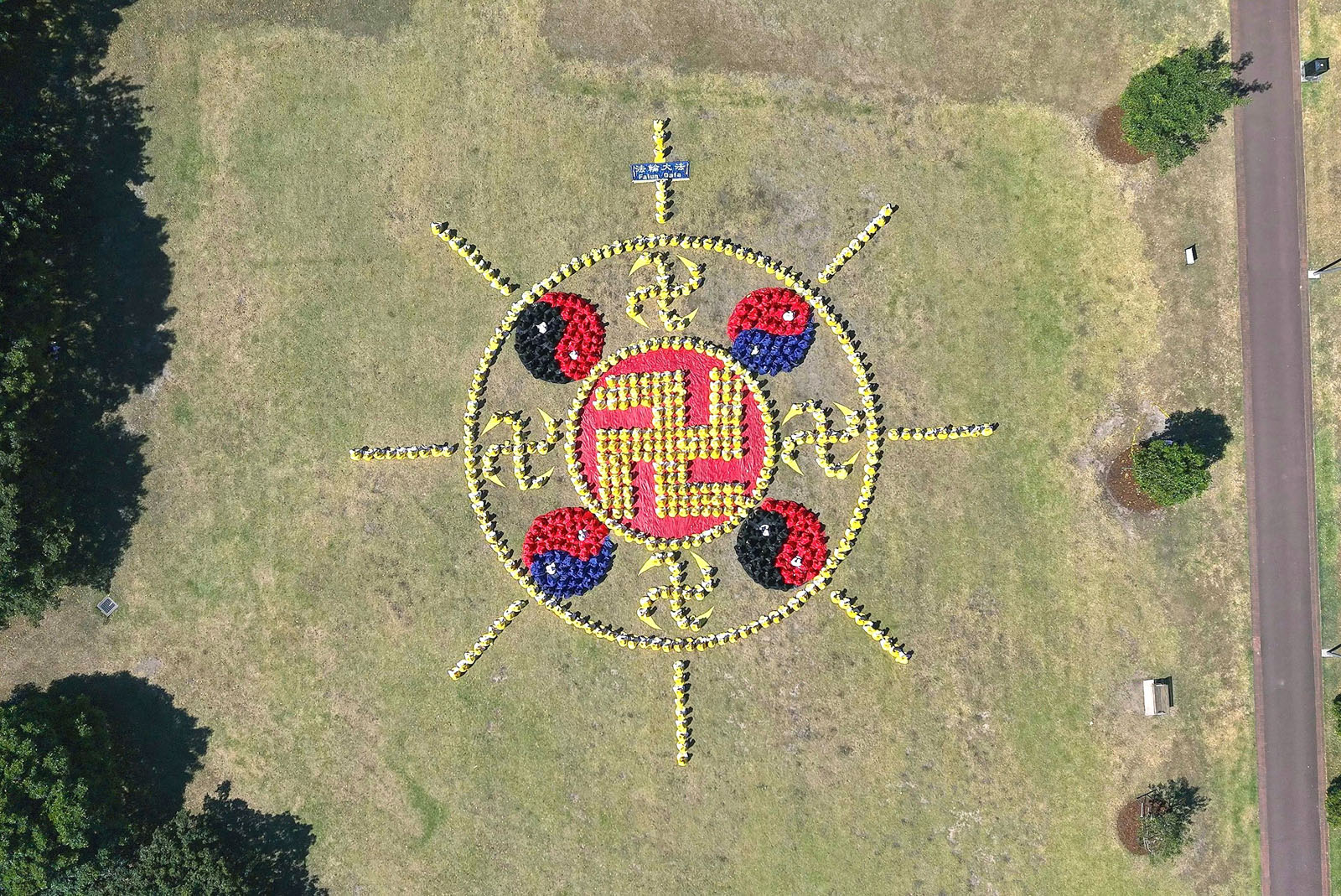 10月11日,在悉尼市中心銀禧水濱公園(Jubilee Park),來自全澳各地的各族裔法輪功學員排出的圖形是巨大的金色法輪。