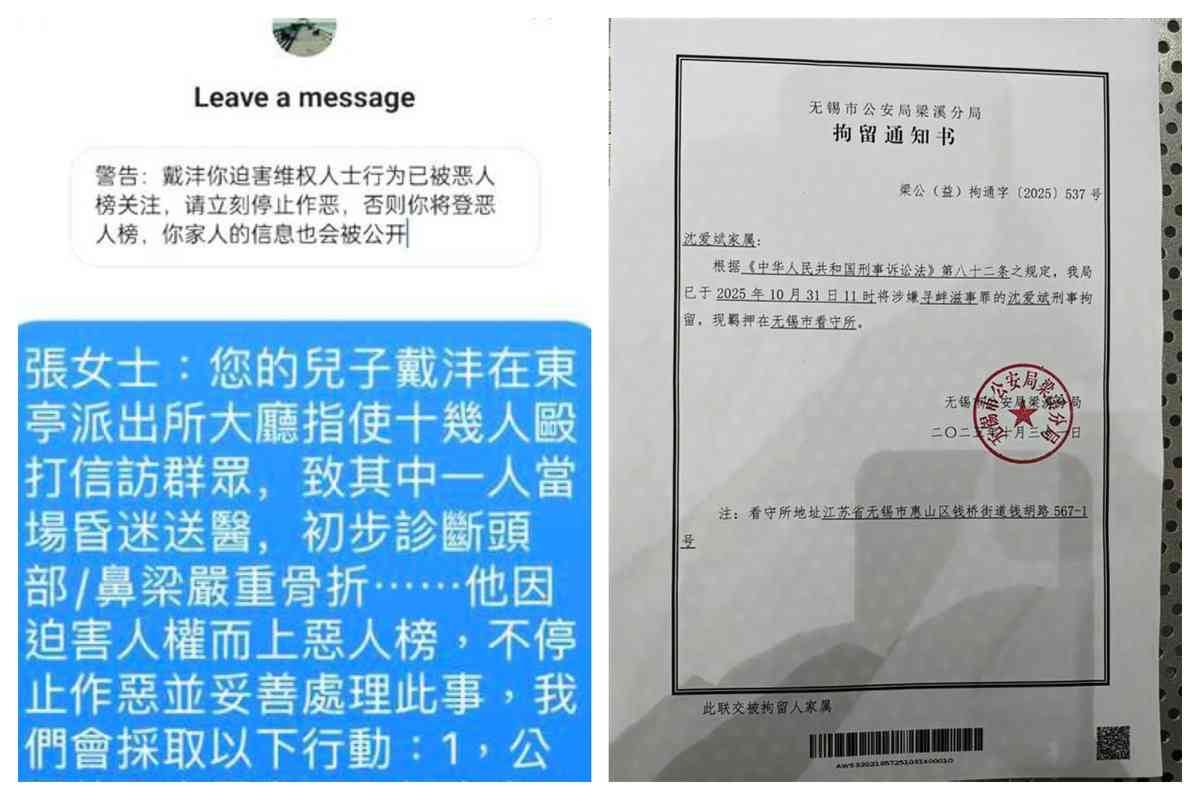 義工傳短訊給戴灃的母親說,「戴灃在東亭派出所大廳指使十幾人毆打信訪群眾,致其中一人鼻樑嚴重骨折當場昏迷送醫。他因迫害人權而上惡人榜,不停止作惡並妥善處理此事,我們會採取必要行動,公開他及家屬名下全部資產及違法記錄,並向中紀委、公安部舉報……。請轉達勸善訊息,勿借執行公務而行惡之事。請三思而後行!」#