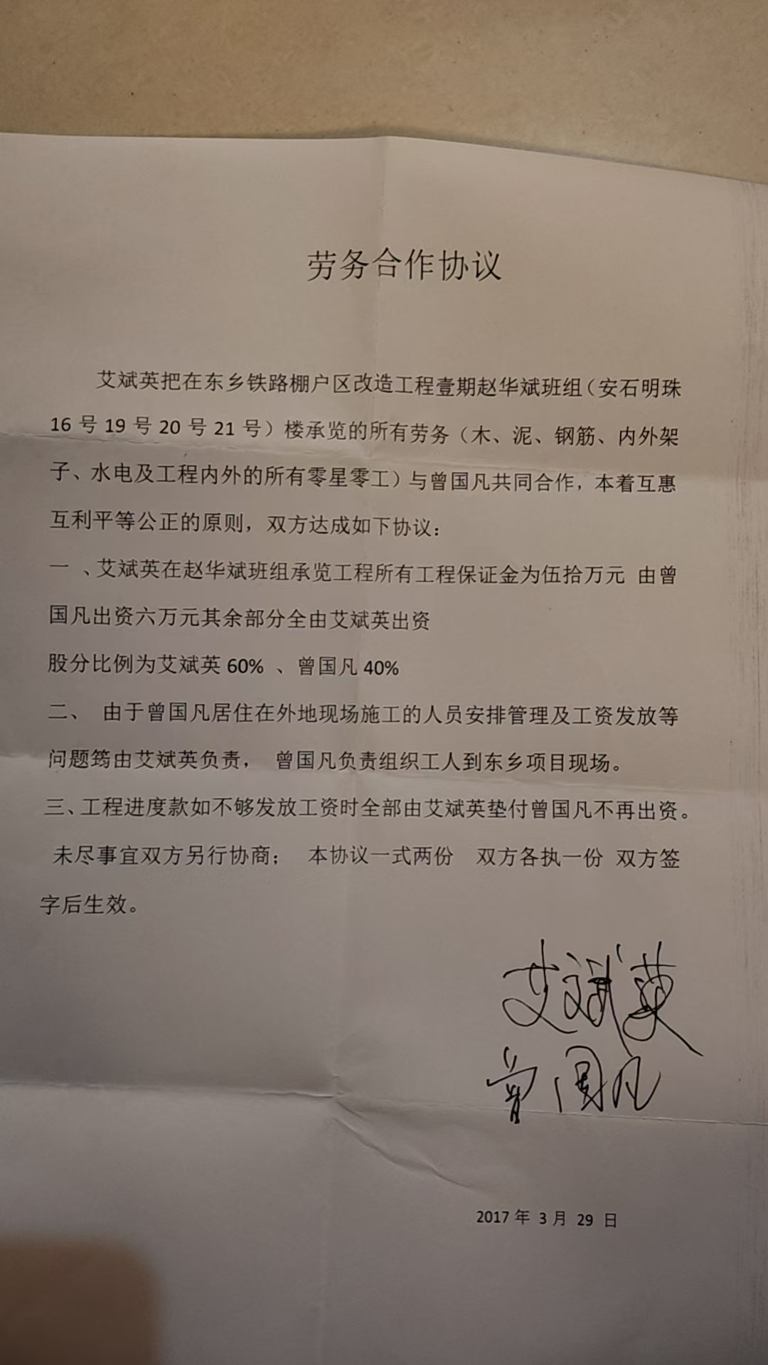 撫州市東鄉區職工保障性住房一期項目於2019年底竣工,工程總建築面積3.9萬平方米,曾國凡團隊完成了1.6萬平方米的工程。當年職工已陸續入住,遭拖欠的工程款逾840萬元,已收到120萬元,還有720萬一直遭到拖欠。
