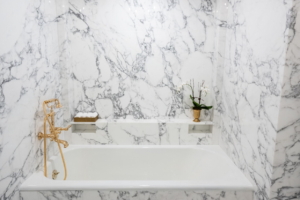 這間浴室原本以裝飾藝術風格的綠色瓷磚為特色,現在鋪滿了延展的黑色與白色大理石,並配有金色的衛浴設備。