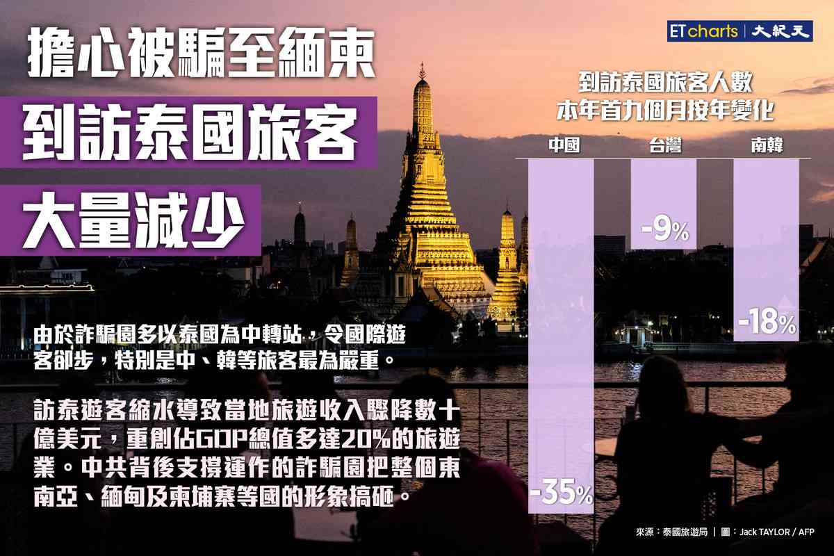 由於詐騙中心多以泰國為中轉站,令國際遊客卻步,特別是中、韓等旅客大量減少。根據2025年首九個月數據,泰國來自中國大陸遊客銳減35%、台灣跌9%、南韓縮水18%。遊客大幅減少導致當地旅遊收入驟降數十億美元,重創佔GDP總值多達20%的旅遊業。10月,泰國央行把今年旅客到訪人次由3,500萬下調至3,300萬,相比疫前2019年的4,000萬人次有著顯著差距。若泰國的旅遊業協會ATTA心急如焚,敦促政府積極領導,防止信心長期流失。