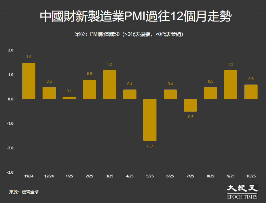標普全球聯合RatingDog於3日公布最新中國製造業PMI(採購經理指數),10月份錄得50.6,相比上月51.2有所減弱,惟仍高於50的榮枯線,但數值卻低於市場預測的50.9。