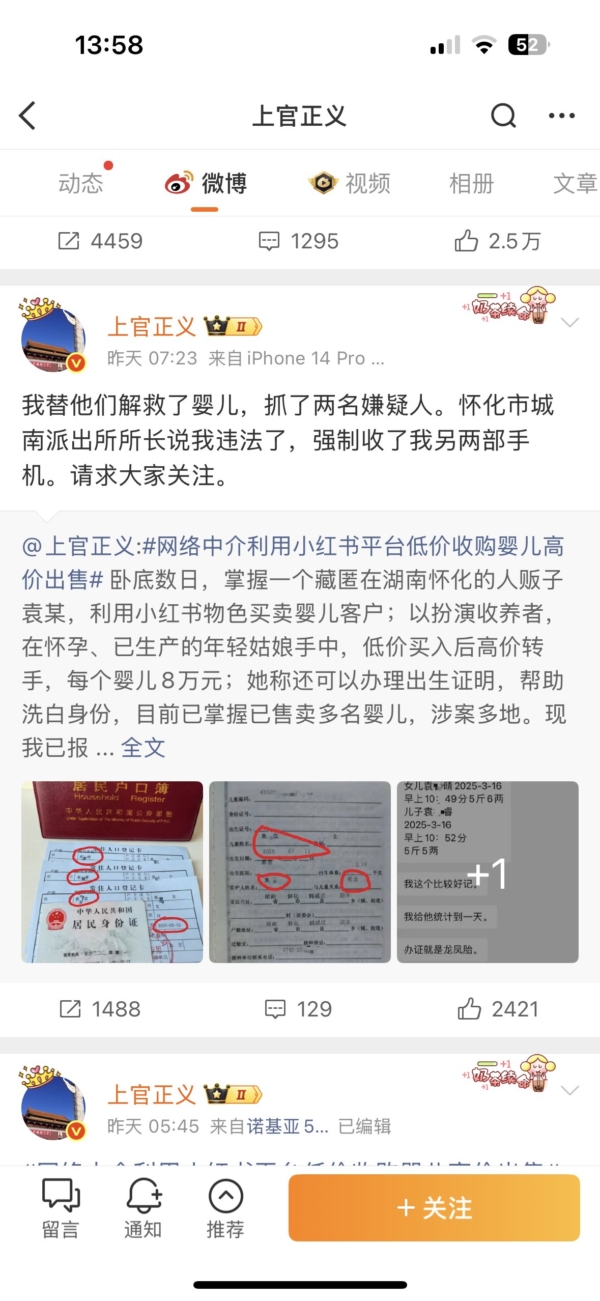 當天稍後,上官正義發帖稱,「我中午替他們解救了嬰兒,拉了兩名嫌疑人。懷化市城南派出所所長說我違法了,強制收了我兩部手機,(派)專人看管我。請求大家關注。」