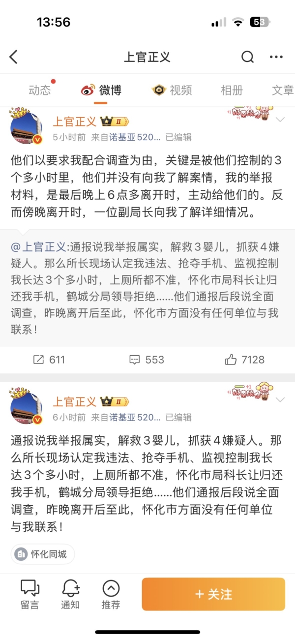 在2日警方通報發布後,上官正義再次發文表示:「通報說我舉報屬實,解救3嬰兒,拘捕4嫌疑人。那麼所長現場認定我違法、搶奪手機、監視控制我長達3個多小時,上廁所都不准,懷化市局科長讓歸還我手機,鶴城分局領導拒絕……他們說全面調查,昨晚離開後至此,懷化市方面沒有任何單位與我聯繫! 」