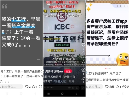 10月29日晚開始,大陸工行的一部份存戶發現工行的App出現異常,導致儲蓄、理財、負債等都變為零,社交媒體上一片混亂。不少工行的存戶表示,當看到App上自己的存款變為零時,嚇懵了。