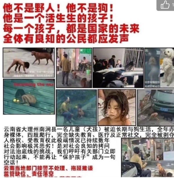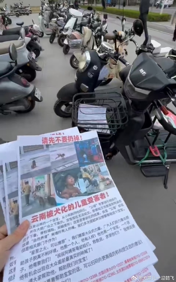 有網民上傳圖片顯示,一份寫著「雲南被犬化兒童的受害者」紅色字體的傳單,呼籲人們關注。傳單寫道:「他是一個人,他有人權,他也是一個寶寶,一個孩子,他需要我們!」「我們多次提出異議,但是相關部門不作為。」呼籲民眾幫助。