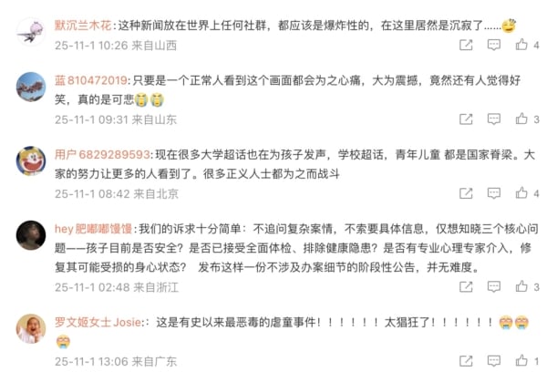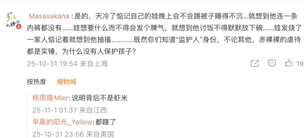 很多網民表示,「這是有史以來最惡毒的虐童事件!!!!!!太猖狂了!每次看到他的訊息都是震驚!憤怒!!怎麼能被這樣對待,就是個幾歲的小寶寶!然而我們看到的才是冰山一角啊,孩子啊,你小小的身軀到底承受了多少了,為甚麼你到這個世上要受這麼多磨難,已經泣不成聲了,求求有關方真的作為吧,這個孩子這幾歲的年齡已經把正常人幾輩子的苦都受盡了吧。來救救他吧來救救他吧。」
