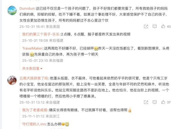 一個也是孩子的媽媽的網民發帖說,「我們能共鳴,是因為我們是正常人,作為一個孩子的媽媽更加心痛,因為養過孩子,知道這麼大的孩子,眼裏應該是探索是好奇,絕不是空洞,臉上表情是豐富多彩,絕不是麻木,表情動作是嬌俏叛逆,絕不是溫順討好,他用了多堅強的生命力,才讓我們看到每一次爆出來的圖片,一張比一張反人性。」