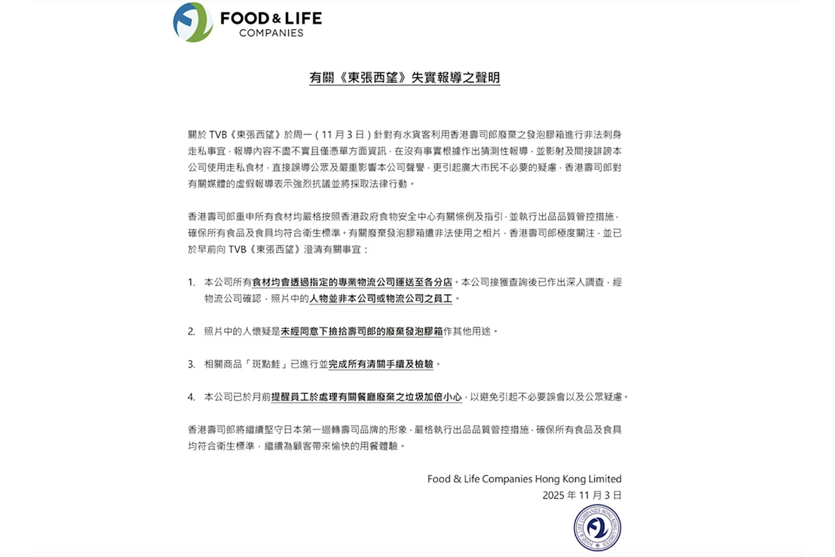 被網民質疑的連鎖壽司店「壽司郎」母公司Food & Life Companies於當晚發聲明,指節目「報道不盡不實且僅憑單方面資訊」,批評節目在「沒有事實根據作出猜測性報道,並影射及間接誹謗本公司使用走私食材」。Food & Life Companies強調所有食材均經指定冷鏈專業物流公司送抵分店,並稱有關節目刊登的照片內的人物,並非該公司或其物流合作夥伴員工;相關貨品亦已完成清關手續及檢驗。聲明還表示,公司已提醒員工加倍處理垃圾,對於相關報道,「壽司郎」方面表示會採取法律行動。