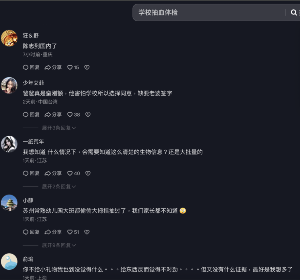 「我們都是不問,直接抽的。」「所以說誠信沒了,再想有就難了。」「我們都是學校抽完回家才知道的,根本沒有同意書。」「學其實已經可以不上。」「他們做這個目的是甚麼?調查甚麼。」
