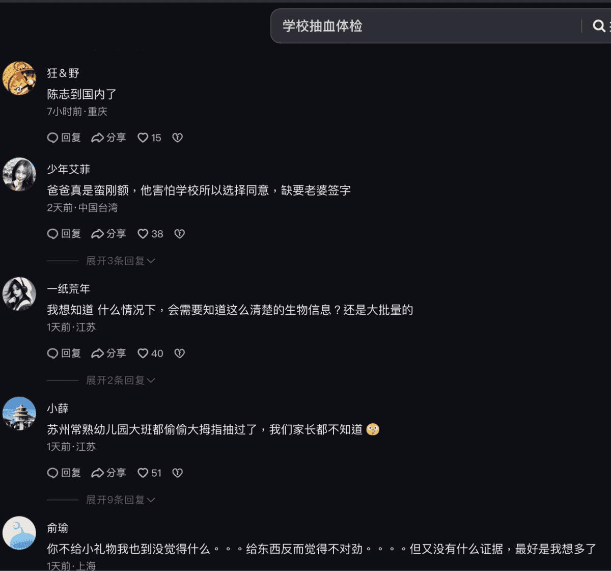 「疾控中心?想當年。」「必須不同意。上次幼兒園偷偷採血真心亂來。」「校園是(電詐)園區的重要組成部份。」「建議大家都讀一讀余華的《活著》,看看富貴的兒子是怎麼死的。」「(太子集團)陳志到國內了。」