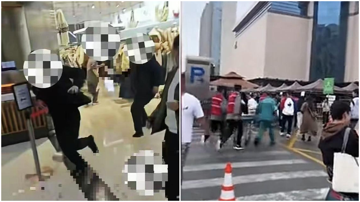 另一段影片中,多名商場保安正在追趕嫌疑人,周圍顧客彎腰躲避或者逃離現場。