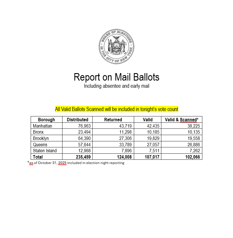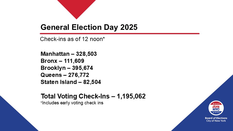 紐約市選舉委員會(BOENYC)中午表示,紐約市2025年大選投票人數突破110萬。