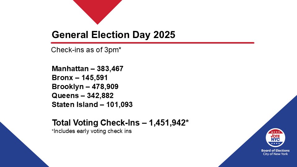 2025年紐約市選民投票熱情高漲。根據紐約市選舉委員會(BOE NYC)最新統計,截至11月4日下午3時,全紐約市投票人數(含提前投票)已達1,451,942人。